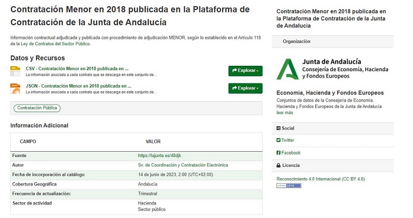 De ahí que la Junta de Andalucía ponga a disposición de toda aquella persona que esté interesada en su consulta, toda la Información contractual adjudicada y publicada con procedimiento de adjudicación menor, un procedimiento extraordinario que debe cumplir los requisitos fundamentales de tener un valor inferior a 40.000 euros cuando sean contratos de obras, y 15.000 cuando se trate de contratos de suministro o de servicios; y de tener una duración máxima de un año sin posibilidad de prórroga. Los conjuntos de datos desde 2018 a la actualidad se pueden consultar tanto en formato CSV (formato asociado a la creación de tablas de contenido) y JSON (formato de texto sencillo para el intercambio de datos).
