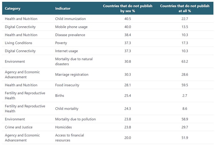 Las categorías de datos que utilizan indicadores con normas internacionales bien establecidas, como demografía y migración, fecundidad y salud reproductiva, y empleo y uso del tiempo fueron las que obtuvieron las puntuaciones más altas. Sin embargo, los datos de salud y nutrición tienen algunas de las puntuaciones más bajas en cuanto a disponibilidad, hecho que puede tener efectos drásticos., ya que se sabe que hombres y mujeres tienen diferente acceso y utilización de los recursos sanitarios, así como diferencias en los riesgos y la susceptibilidad a las enfermedades.