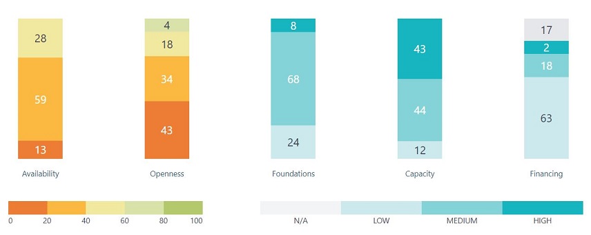 • Disponibilidad - Identifica la medida en que los datos de género están disponibles para 53 indicadores relevantes de género a través de los sitios web de los institutos nacionales de estadística (INE) y otros sitios web gubernamentales. Estos datos permiten a los responsables políticos y a los ciudadanos comprender y abordar los problemas a los que se enfrentan las mujeres y las niñas. Para ser completos, no sólo deben estar disponibles por sexo, sino a lo largo de varios años, con desgloses geográficos y otros importantes, como la edad o el estado de discapacidad
