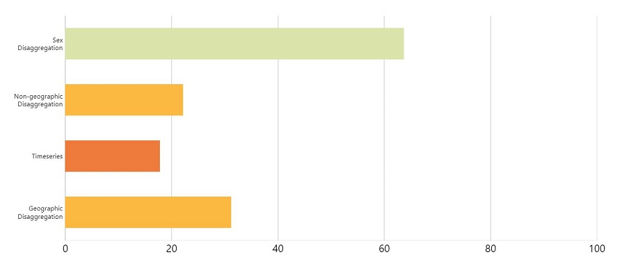 En general, no se dispone de datos desglosados y detallados por sexo. Y si se dispone de datos desglosados por sexo, a menudo no se desglosan por otros subgrupos, como edad, discapacidad, raza o ubicación. Sin esa información, las políticas y los programas gubernamentales pueden no centrarse en las necesidades específicas de las poblaciones a las que sirven. La puntuación media del desglose geográfico en todos los indicadores es de algo más de 31 y de 22 para el desglose no geográfico, siendo los indicadores con mayor puntuación la población, el empleo y el desempleo. El elemento de disponibilidad de datos con menor puntuación en todos los indicadores es la disponibilidad de datos cronológicos.