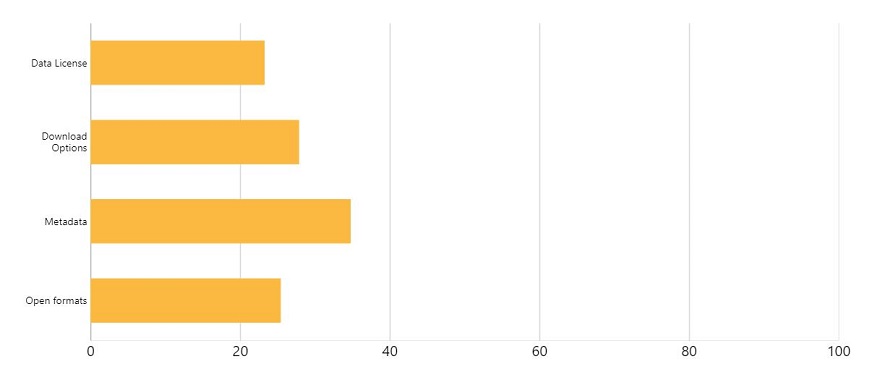 No es suficiente con subir una tabla o un gráfico a un sitio web, ya que para que los datos sean totalmente abiertos, deben publicarse en un formato abierto que sea legible por máquina y no esté protegido por derechos de propiedad intelectual, de modo que los datos puedan extraerse, reutilizarse y analizarse fácilmente con programas de código abierto. También deben poder entenderse de manera correcta y descargarse de modo sencillo con múltiples opciones para los usuarios que faciliten un mejor acceso e ir acompañados de una licencia abierta que permita su libre uso y reutilización, incluso con fines comerciales. En el análisis de la Brújula ningún elemento de apertura supera los 40 puntos a nivel mundial. El elemento con mayor puntuación es la disponibilidad de metadatos, con 34,7.