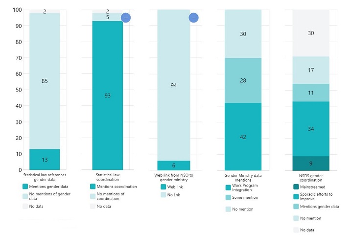 La Brújula identifica que sólo el 13,2% de las leyes estadísticas incluyen el género, es decir, al menos identifican el género como un tipo de datos que deben recopilarse. Además, 7 de cada 10 ministerios de género mencionan los datos de género, pero sólo 4 de cada 10 tienen un programa de trabajo dedicado a los datos de género, y sólo el 6% de los INE proporcionan enlaces web al ministerio competente en materia de género. Otro dato relevante es que únicamente 1 de cada 8 planes estadísticos disponibles integra los datos de género.