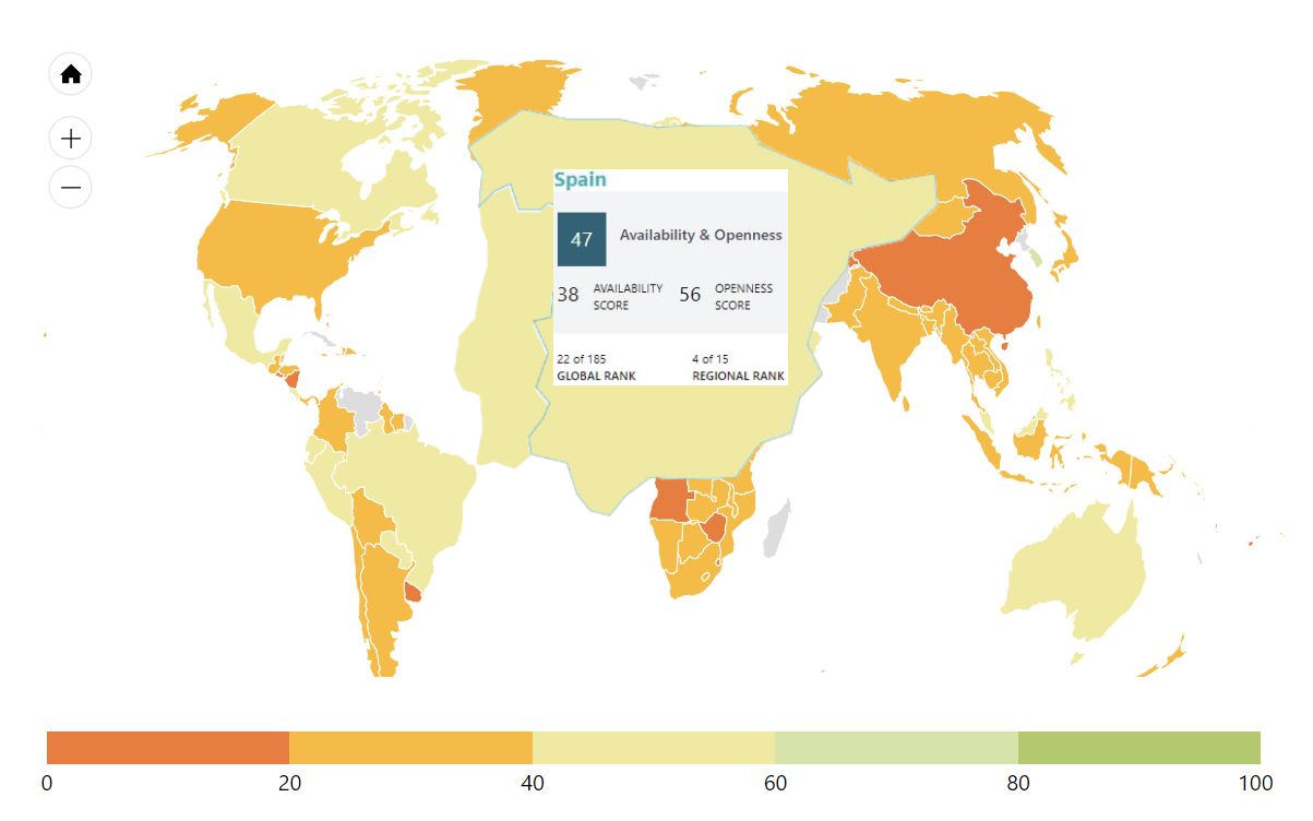 La puntuación para España en disponibilidad y apertura es de 47, por los 65 del Reino Unido, referencia por su primera posición en el ránking. Disgregando por cada uno de ellos, el dato para la disponibilidad es de 38, mientras que para la apertura llega hasta 56. Reino Unido cuenta con 55 y 74 puntos, respectivamente. Portugal, nuestro vecino, tiene un dato de 56 en disponibilidad y apertura, siendo de 47 para la primera y de 65 para la segunda.