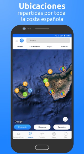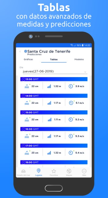 Aplicación que permite conocer el estado del mar, tanto en tiempo real como para los próximos días. Ofrece información detallada de oleaje, nivel del mar, viento, presión atmosférica o temperatura del agua, entre otros, para cada localidad, playa y puerto de España. Además, permite la creación y gestión de ubicaciones favoritas, lo que facilita un acceso inmediato a los datos disponibles.