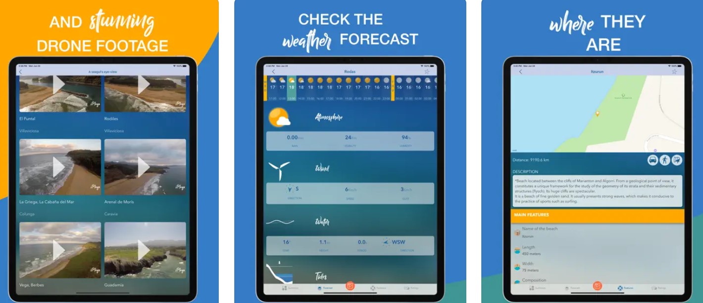 Esta aplicación facilita la consulta de la playa que te interese y la localización de sus características y servicios disponibles, la previsión meteorológica (sobre información proporcionada por la Agencia Estatal de Meteorología), vídeos de drones, fotografías y valoraciones de otras personas usuarias.