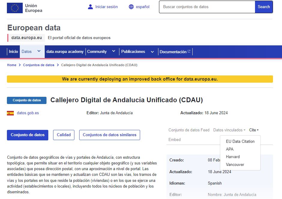 Un ejemplo de citación dentro de la web data.europa.eu es el Callejero Digital de Andalucía Unificado (CDAU), un conjunto de datos geográficos de vías y portales de Andalucía, con estructura topológica, que permite situar en el territorio cualquier objeto geográfico (y sus variables asociadas) que posea dirección postal, con una aproximación a nivel de portal.