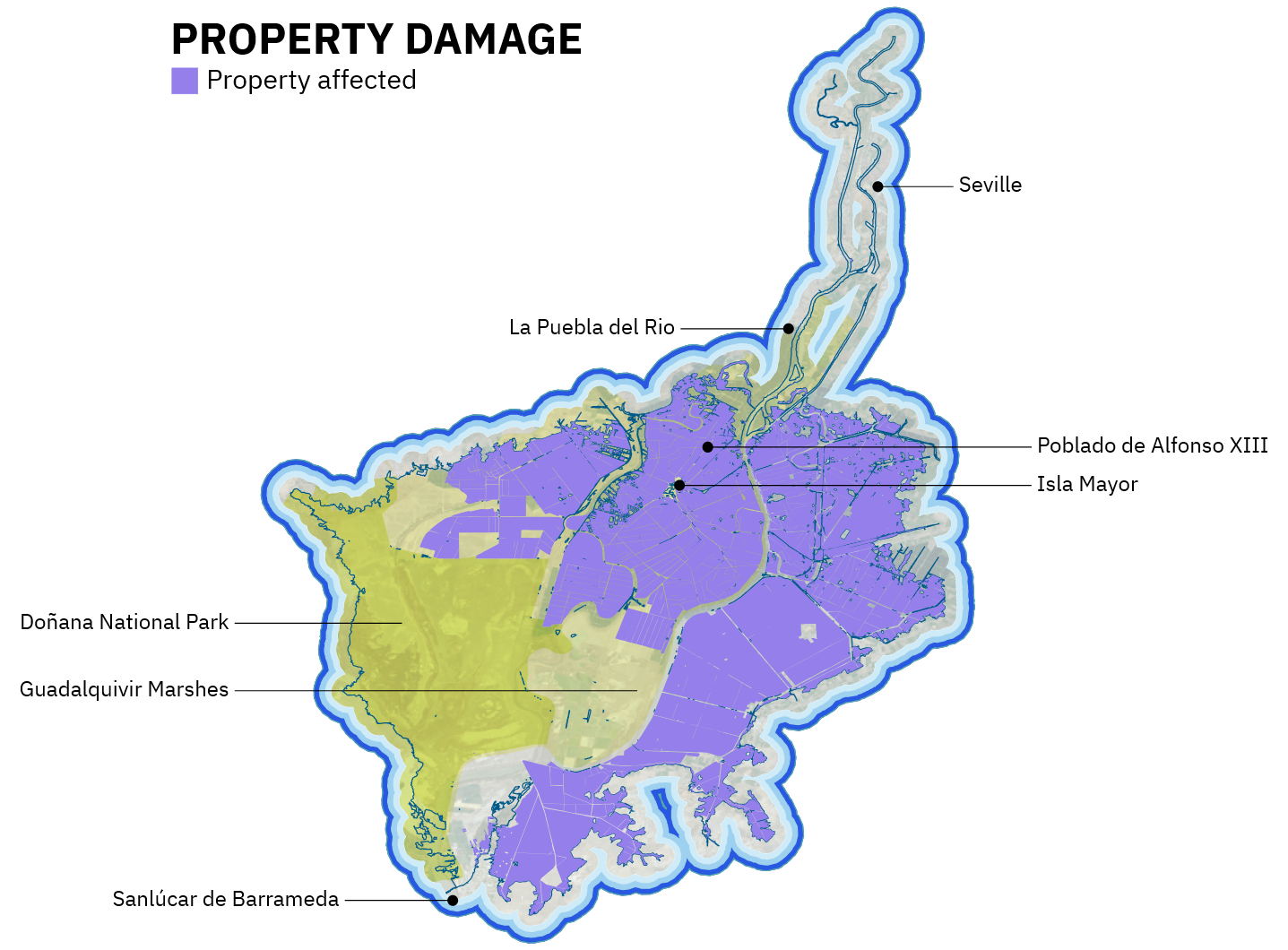 Las propiedades cercanas a la parte del río Guadalquivir que se encuentran en el entorno de La Puebla del Río, el Poblado de Alfonso XIII e Isla Mayor también pueden estar en riesgo de inundación en el futuro, al igual que las más de 6000 personas que viven en la zona.