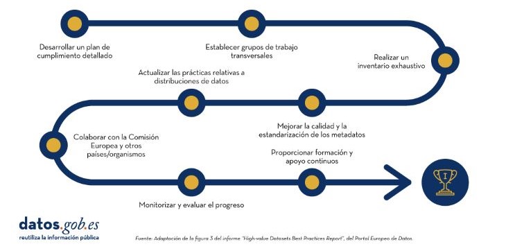 En lo referente a la recopilación por parte de data.europa.eu, basándose en los puntos finales comunicados por los Estados miembros a través de una encuesta de la UE (que data de septiembre de 2024, con una actualización a finales de 2024), data.europa.eu recopilará los conjuntos de datos anotados como HVD en los portales nacionales de datos abiertos y geoportales y sus metadatos se actualizarán automáticamente para incluir las propiedades de HVD según los procesos de recopilación automática establecidos. En esta infografía de la web datos.gob.es se recogen los 8 pasos sugeridos por la UE para el cumplimiento del reglamento de implementación de HVD: