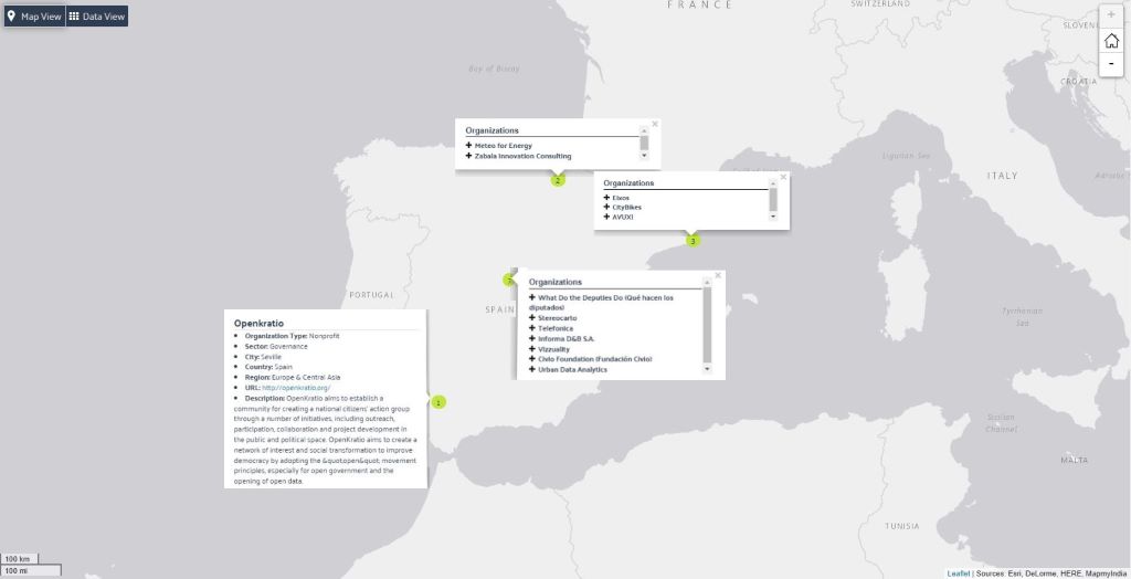 El Mapa, que se ha convertido en una realidad tangible gracias a la comunidad global de datos abiertos, incluye un total de 1.615 organizaciones (empresas, organizaciones sin fines de lucro, instituciones académicas y grupos de desarrolladores), pertenecientes en la actualidad a un total de 90 países, que hacen uso de los datos abiertos de carácter público para la promoción, el desarrollo de productos y servicios, la mejora continua de las operaciones, la obtención de información estratégica y la realización de diferentes investigaciones.