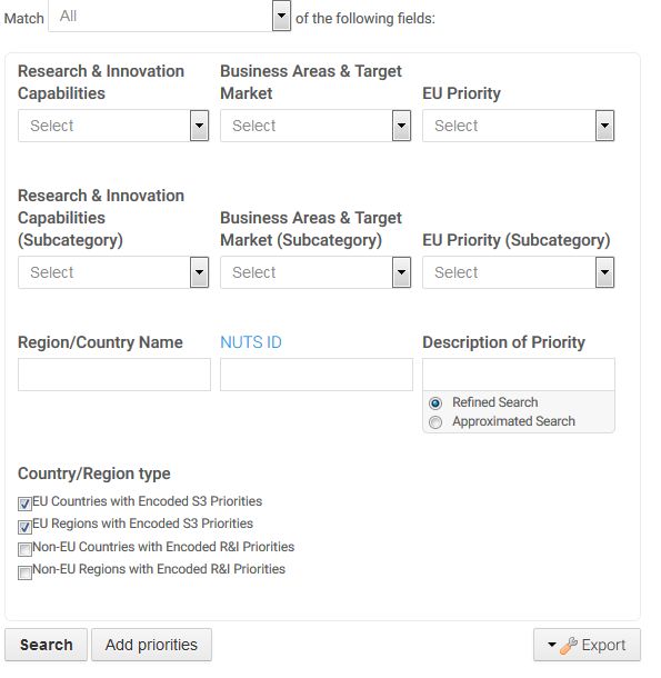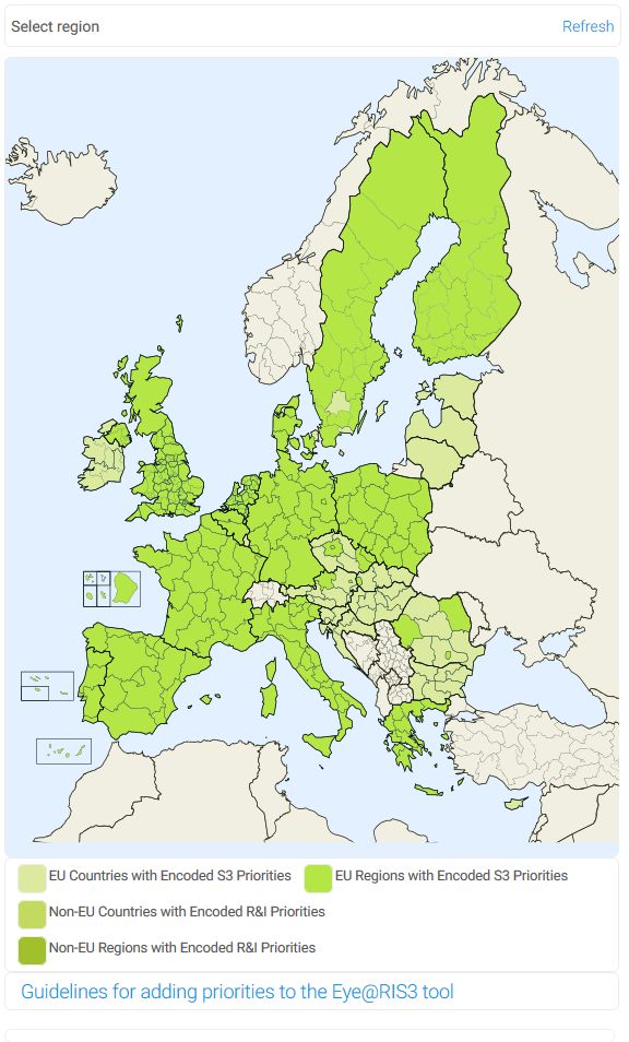 Recopila y presenta las prioridades de innovación de casi todos los estados y regiones de la Unión Europea (UE) y países vecinos para el periodo 2014-2020. La aplicación muestra las tendencias del mercado y facilita la cooperación. Es posible la búsqueda en Eye@RIS3 mediante todas o parte de las categorías, y también a partir del texto de las descripciones. Puede buscarse por regiones y prioridades nacionales concretas a través de su nombre o identificador NUTS.
