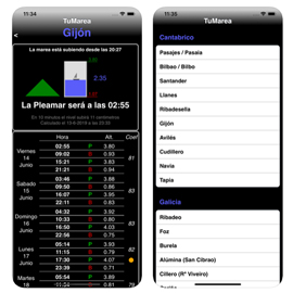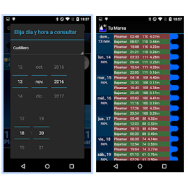 La aplicación permite tener acceso a todas las tablas de mareas de los 69 puertos españoles con datos propios. La pantalla principal muestra el estado actual, alturas y velocidad de la marea en la ubicación seleccionada.