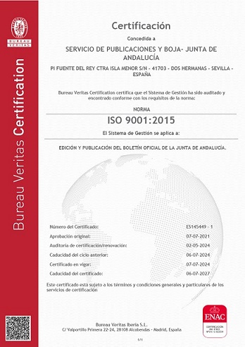 El Servicio de Publicaciones y BOJA, unidad dependiente de la Secretaría General Técnica de la Consejería de Sanidad, Presidencia y Emergencias de la Junta de Andalucía, consciente de la importancia que supone la Calidad en la realización del servicio de 'Edición y publicación del Boletín Oficial de la Junta de Andalucía', ha establecido en su organización un Sistema de Gestión de Calidad en el trabajo basado en el cumplimiento de:
