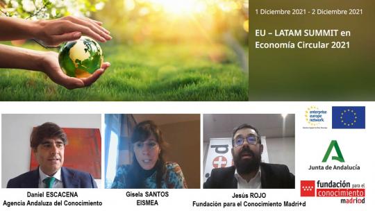 Más de 150 participantes de 9 países (Argentina, Bélgica, Chile, Italia, Méjico, Perú, Portugal, Uruguay y España) se han dado cita este mes de diciembre en el evento virtual EU – LATAM SUMMIT 2021, organizado por la Agencia Andaluza del Conocimiento (AAC) y los nodos de América Latina de la Enterprise Europe Network (EEN), centrado en economía circular y en el que también colabora la Fundación para el Conocimiento Madri+d.