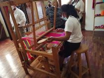 Artesana tradicional lenca realizando una demostración en su telar.