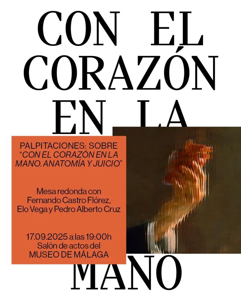 El Museo de Málaga, dependiente de la Consejería de Cultura y Deporte, acoge el miércoles 17 de septiembre, a las 19.00 horas, la mesa redonda ‘Palpitaciones sobre: Con el corazón en la mano. Anatomía y juicio’. Esta actividad, que se va a desarrollar de forma paralela a la exposición, contará con la intervención de Elo Vega (artista participante y profesora de la Facultad de Bellas Artes de Málaga), Pedro Alberto Cruz (redactor de los textos del catálogo y profesor de Historia del Arte de la Universidad de Murcia) y Fernando Castro Flórez (comisario de la muestra y profesor de estética de la Universidad Autónoma de Madrid).