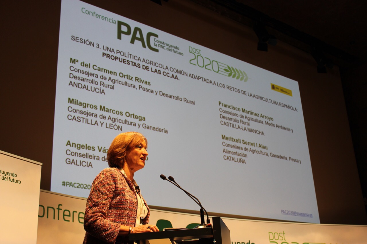 La consejera de Agricultura, Pesca y Desarrollo Rural, Carmen Ortiz, ha defendido en Madrid una Política Agrícola Común (PAC) a partir de 2020 que garantice la "supervivencia del medio rural y el relevo generacional, fomentando el empleo y el mantenimiento del tejido productivo de los pueblos, con especial atención a las explotaciones de pequeño tamaño". Para la consejera, la prioridad es una política agrícola comunitaria que “favorezca a las personas que viven del campo, en el campo y que dan vida al campo".