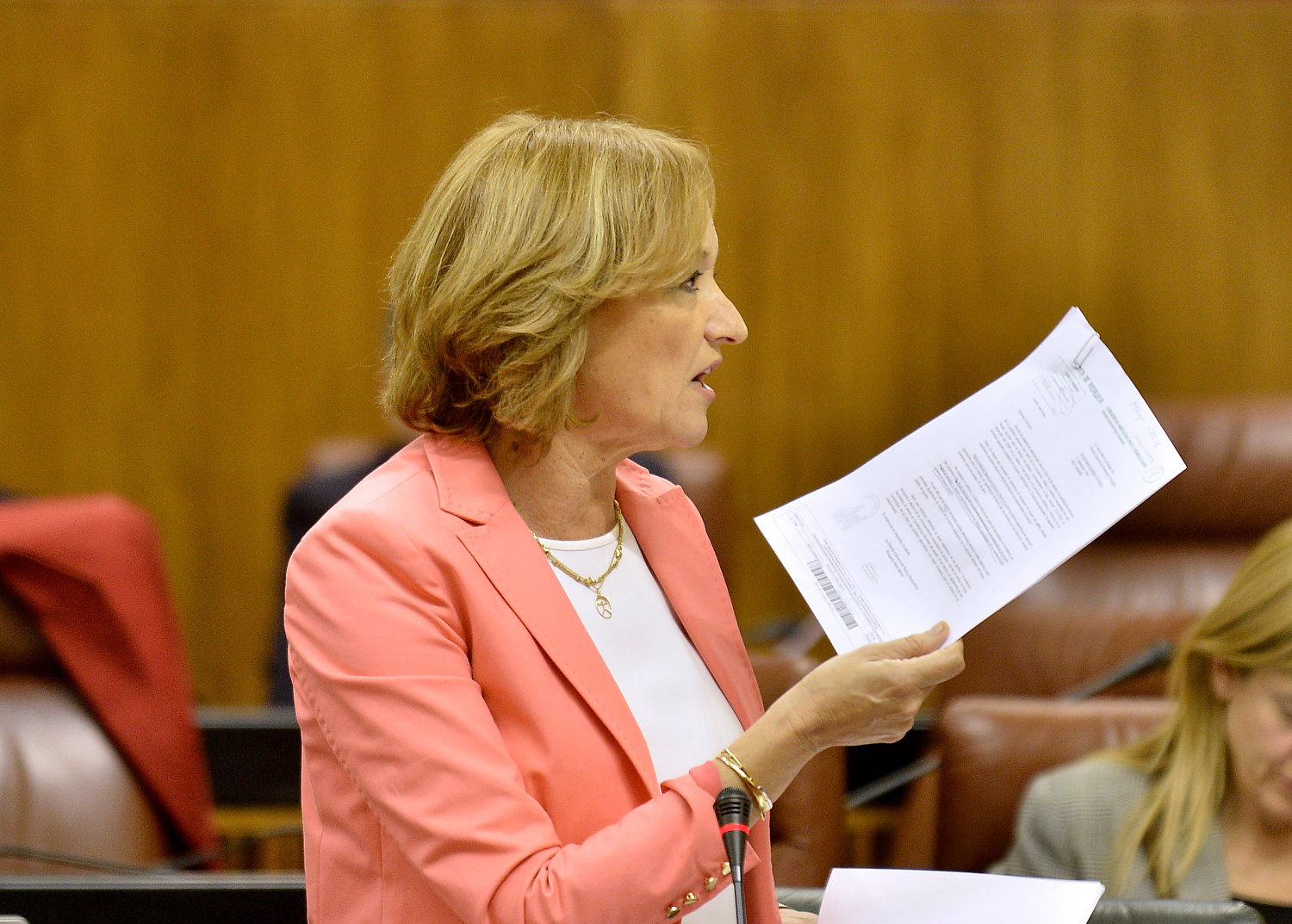 Imagen de Carmen Ortiz en el Parlamento con copias de las cartas enviadas al Ministerio
