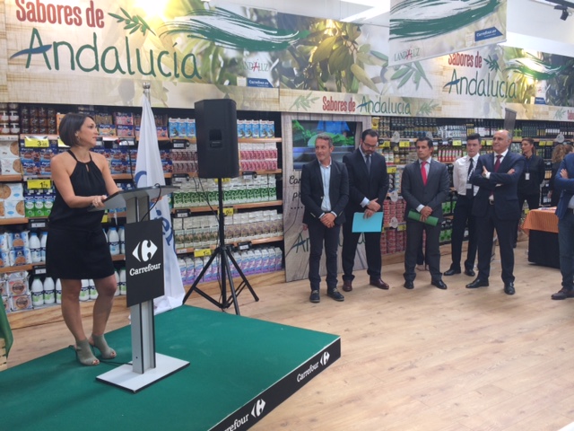 Rosa Ríos ha participado hoy en Camas en la inauguración de la segunda edición de esta campaña promocional en centros Carrefour de Andalucía, una iniciativa que se extenderá hasta el próximo 22 de octubre. El acto de apertura ha contado también con la presencia del tesorero de Landaluz, Asociación Empresarial Alimentos de Andalucía, José Luis Armenteros, y el director regional de Andalucía Occidental de Carrefour, Antonio Pantoja.