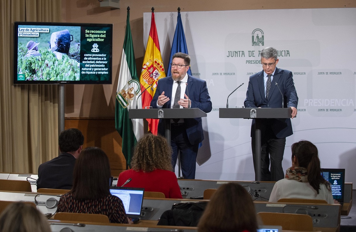 Rodrigo Sánchez Haro presenta la Ley de Agricultura y Ganadería de Andalucía junto al portavoz del Gobierno autonómico, Juan Carlos Blanco.