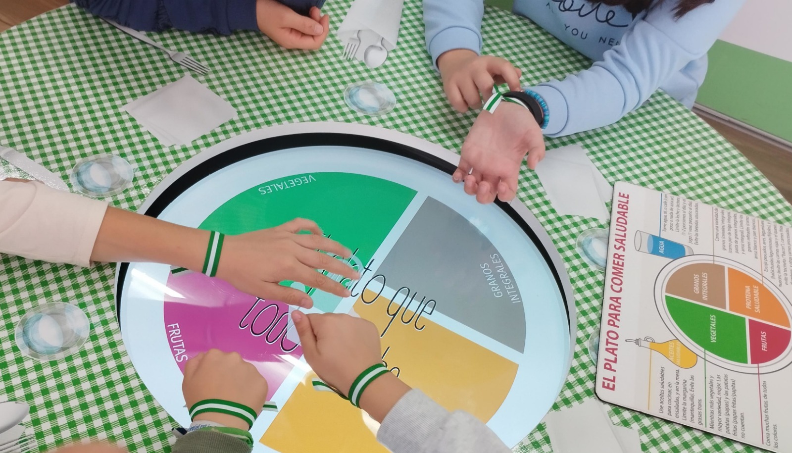 Varios niños en el Frutibús con la pulsera de la bandera de Andalucía