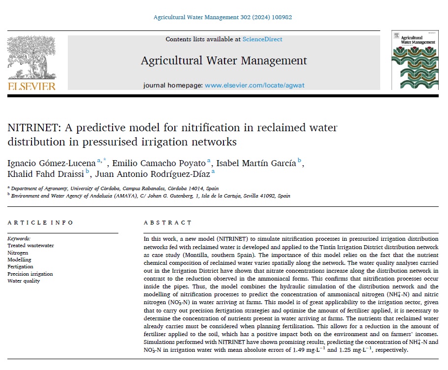 En el artículo “NITRINET: A predictive model for nitrification in reclaimed water distribution in pressurised irrigation networks” (NITRINET: Un modelo predictivo de la nitrificación en la distribución de agua regenerada en redes de riego presurizadas) publicado en “Agricultural Water Management” también ha participado personal del CENTA junto al Departamento de Agronomía de la Universidad de Córdoba, en el marco del proyecto Reutivar 2.0 .