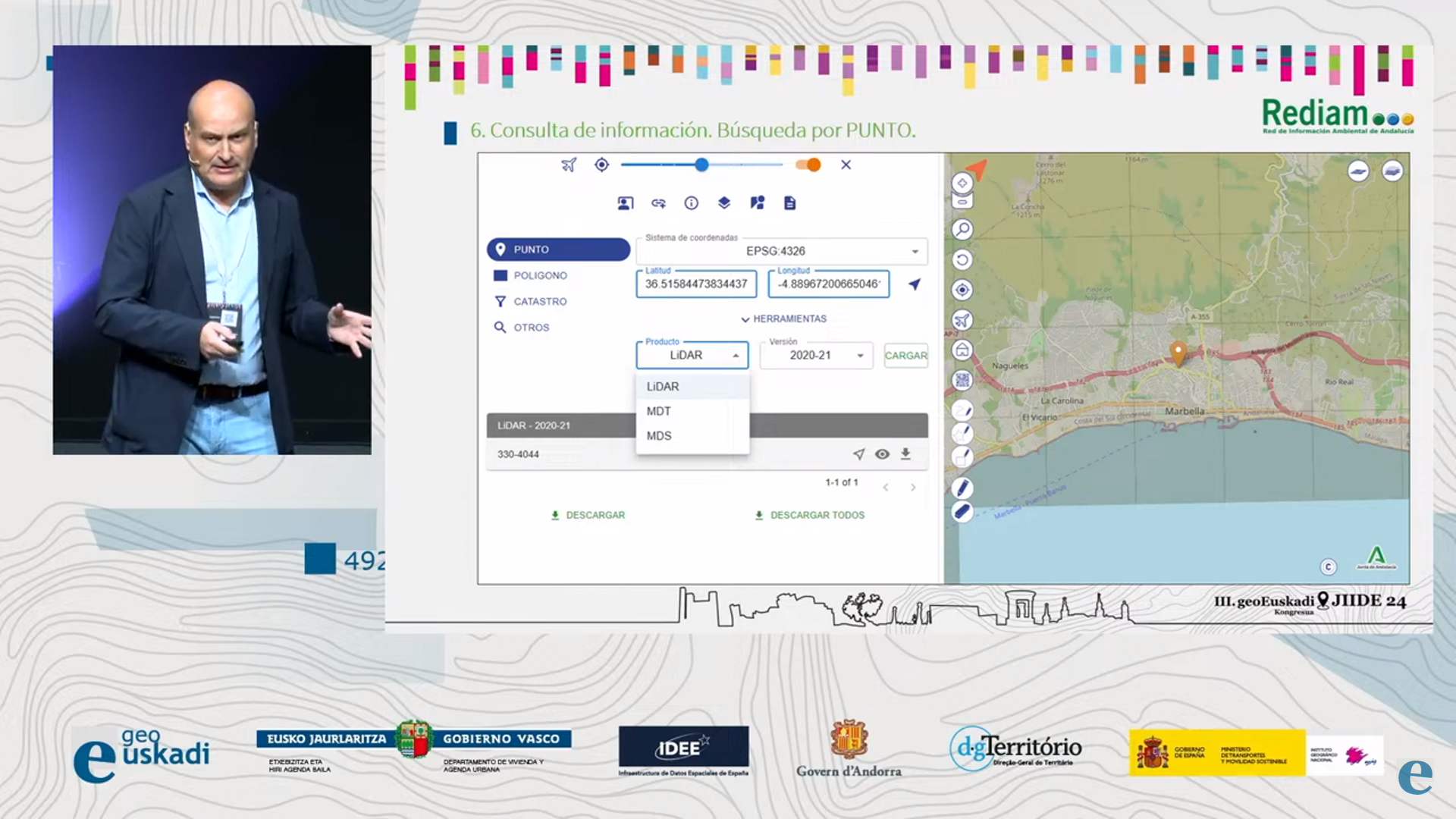 Personal de la Agencia de Medio Ambiente y Agua M.P. asistió a las XX Jornadas de Infraestructuras de Datos Espaciales de España y III geoEuskadi Kongresua de Vitoria del 13-15 noviembre 2024. En las mismas técnicos de REDIAM AMAYA presentaron INDIFO, Herramienta de difusión de Información Forestal/Ambiental en Andalucía, así como el Visualizador de consulta y descarga de nubes de puntos LIDAR, Modelos Digitales de Elevaciones, ortofotografías.