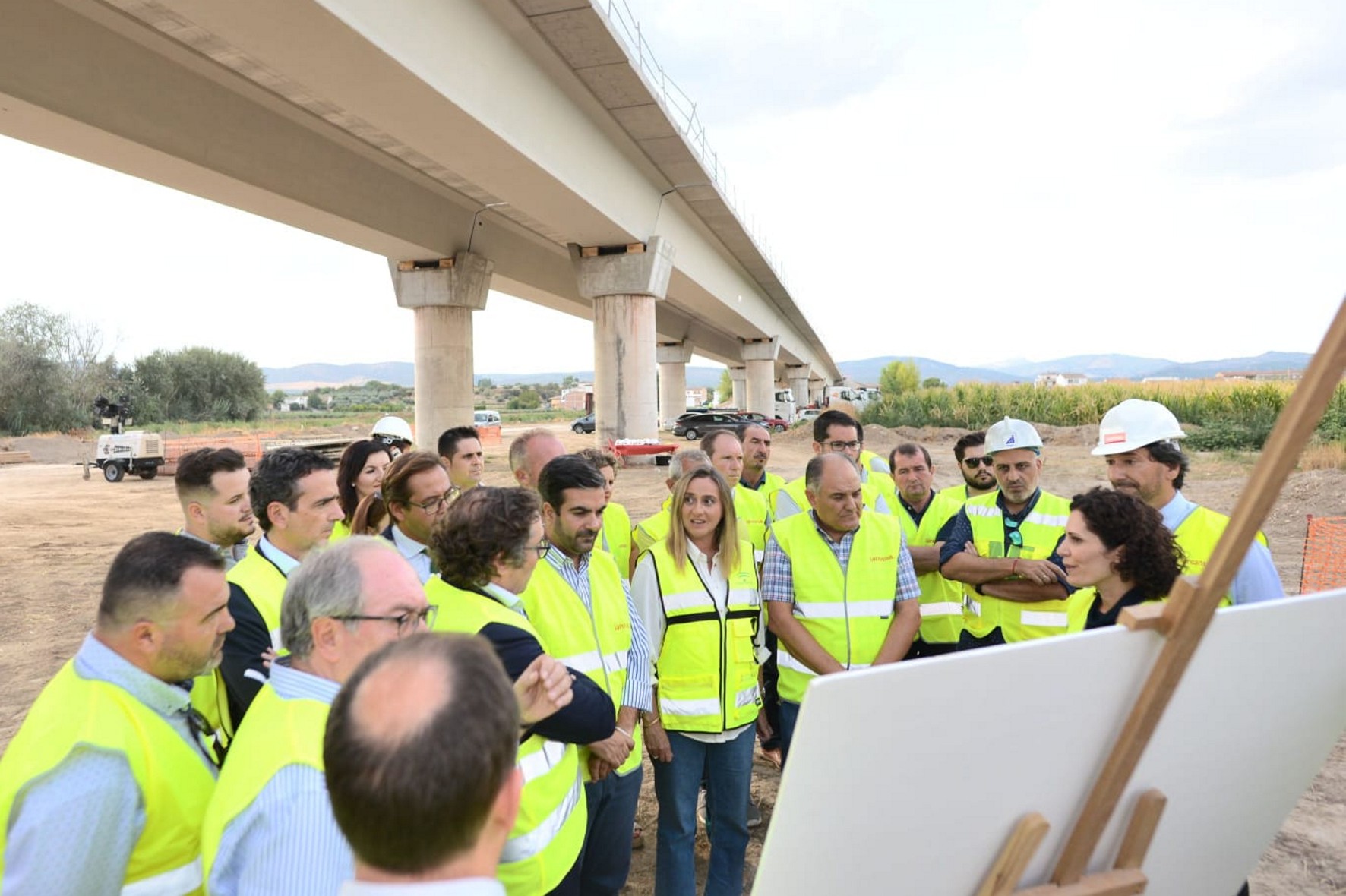 La colocación de las vigas del nuevo puente de Huétor Tájar, que salva el río Genil a su paso por esta localidad granadina, ha finalizado esta semana con la colocación de las cuatro últimas vigas en los vanos 6 y 7 de la margen izquierda del río, más próxima a la Venta Nueva. Se trata de una actuación de gran envergadura, teniendo en cuenta que se ha necesitado el uso de grúas de gran tonelaje y camiones de gran longitud para el transporte de las vigas de dimensiones especiales. La consejera de Fomento, Infraestructuras y Ordenación del Territorio, Marifrán Carazo, ha visitado las obras, junto al delegado territorial de Fomento, Antonio Granados; el director de la Agencia de Obra Pública, Julio Caballero, y el alcalde de Huétor Tájar, Fernando Delgado.