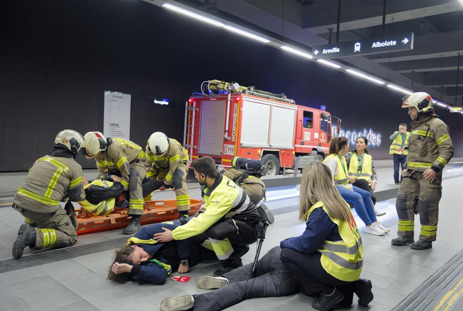 Un centenar de participantes, entre responsables del Metro de Granada, la Consejería de Fomento, Articulación del Territorio y Vivienda, a través de la Agencia de Obra Pública, fuerzas de seguridad, operativos de emergencias y figurantes voluntarios, han intervenido en la pasada madrugada en el simulacro de un incendio en un cuadro eléctrico del túnel del Metro de Granada al paso de un tren en el que viajan 10 figurantes y que ha habido que evacuar por la gran cantidad de humo generado.