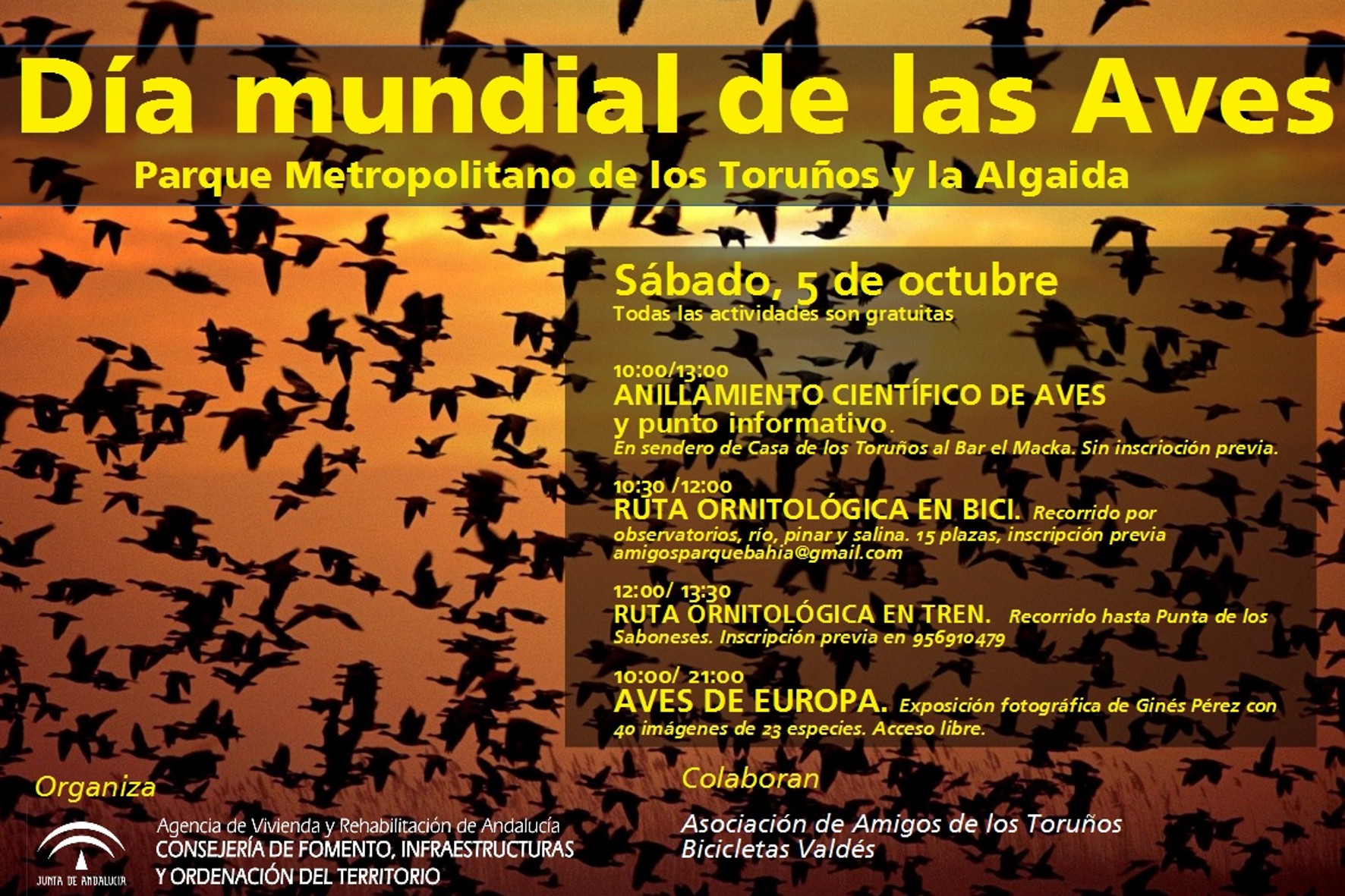 La Asociación Medioambiental Amigos de Los Toruños ha programado, por su parte, una serie de rutas ornitológicas para el avistamiento de aves. Entre las 10.30 y las 12.00 horas hay previstos recorridos en bicicleta desde la Casa de Los Toruños a los distintos observatorios, en el río, el pinar y la salina. Esta actividad tiene plazas limitadas, por lo que las personas interesadas deberán inscribirse previamente mediante correo electrónico (amigosparquebahia@juntadenalucia.es).