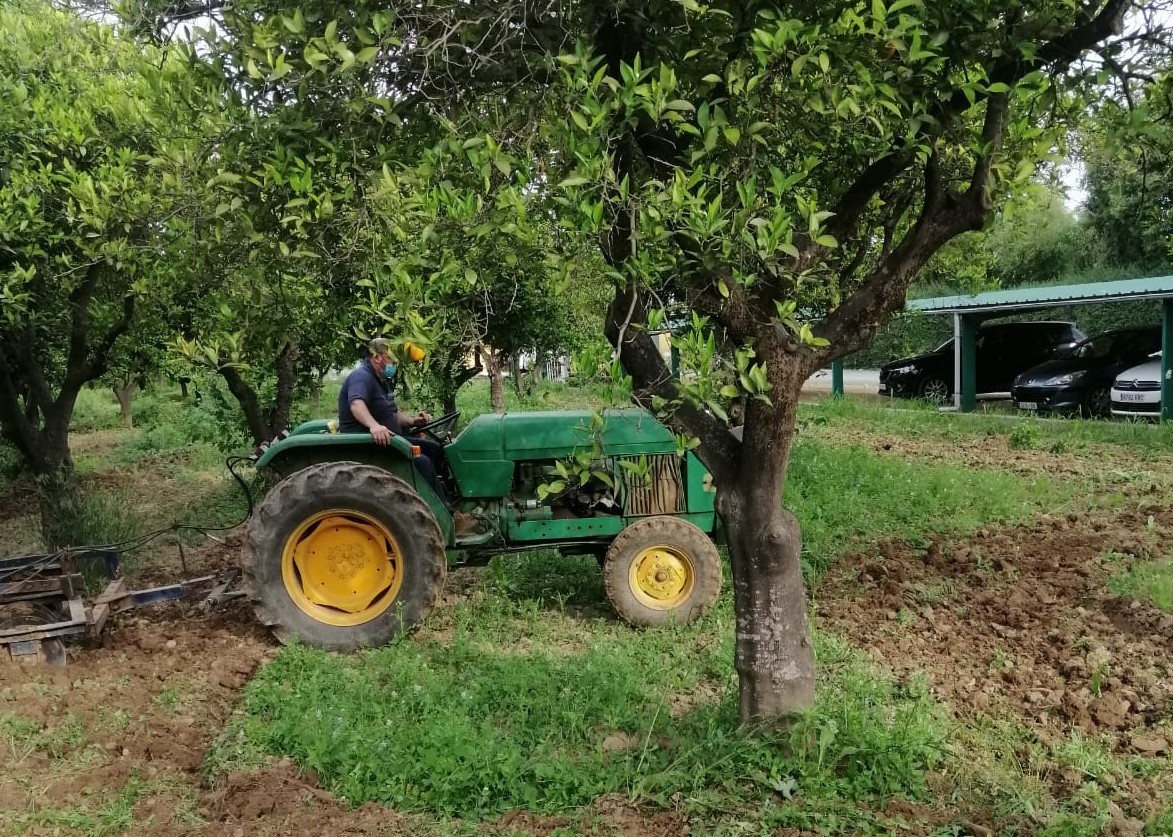 A la instalación de la nueva tubería se suman las tareas de mantenimiento del naranjal que se vienen realizado. En febrero se aportó quelato de hierro a los ejemplares que presentaban clorosis férrica, es decir, carencia de hierro que se manifiesta por un amarilleo en las hojas. Tras ese aporte de hierro, una vez que el Estado de Alarma ha permitido retomar la actividad en el parque, desde el 6 de mayo se viene realizando un aporte extraordinario de macronutrientes a los naranjales, mediante el arado del terreno.