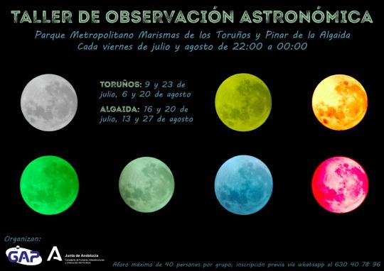 Cartel anunciador de los Talleres de Observación Astronómica que se celebrán en el Parque Metropolitano Marisma de los Toruños y Pinar de la Algaida.