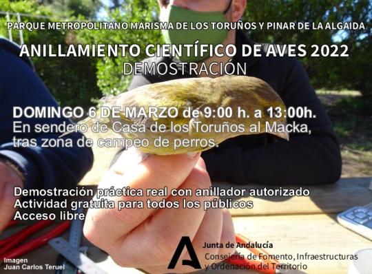 El Parque Metropolitano Marisma de los Toruños y Pinar de la Algaida retoma este domingo, 6 de marzo su programa de talleres de anillamiento de aves con la primera de las 10 sesiones planificadas para este año, que tendrán lugar generalmente uno o dos domingos al mes hasta diciembre. Los talleres se desarrollarán en localizaciones variadas, alternando la marisma de los Toruños y el pinar de la Algaida.