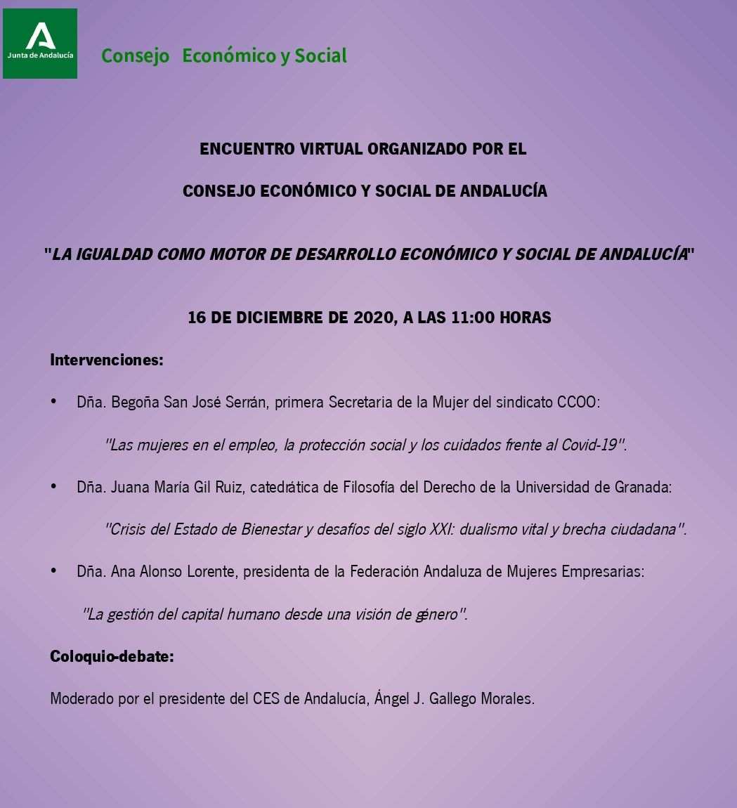 El Consejo Económico y Social de Andalucía celebra un encuentro virtual sobre 'La igualdad como motor de desarrollo económico y social de Andalucía'