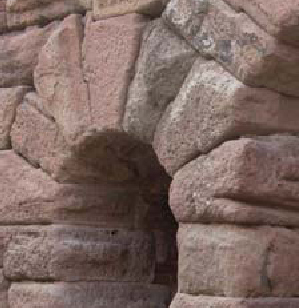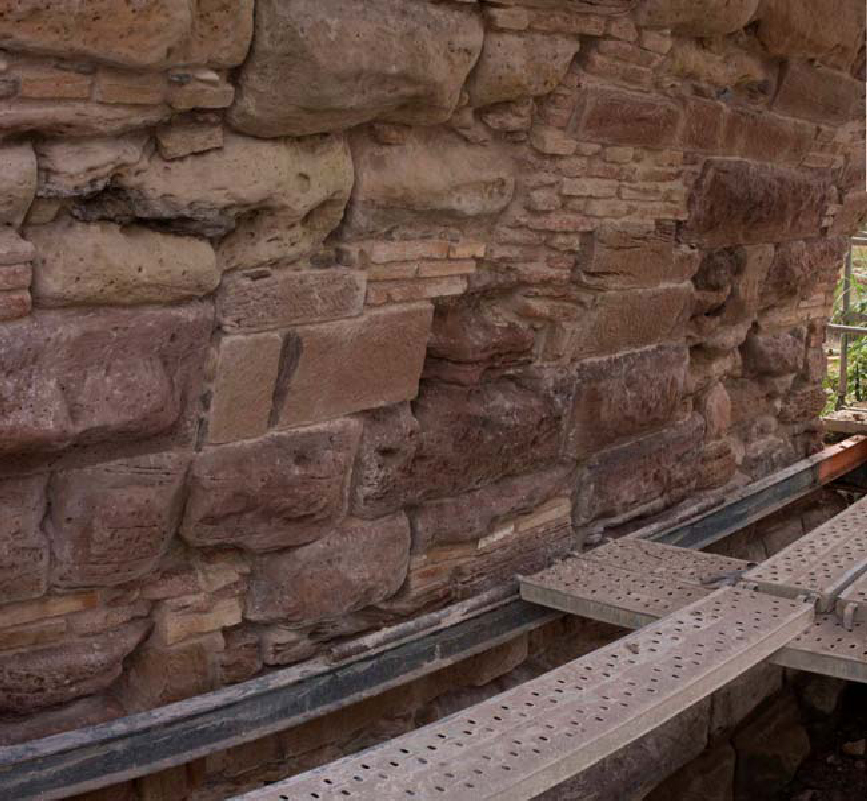 – Para las pérdidas de mayor tamaño en muros se ejecutó fábrica de ladrillo de tejar, colocado a soga, reproduciendo las juntas de sillares cuya cara vista había desaparecido con una junta corrida que reproduce la forma del original.