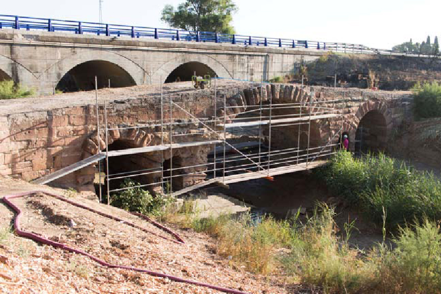 Tras una limpieza de la fábrica, se procedió al rejuntado en muros y dovelas con mortero de cal. Con objeto de consolidar en profundidad las juntas de la fábrica, se vertió mortero por las oquedades de las juntas accesibles desde la superficie del tablero, hasta alcanzar el intradós del arco central. En diversos puntos en los que las juntas lo permitieron, se hicieron taladros hasta la superficie del tablero, desde donde proceder de igual forma, con el propósito de que la parte más delgada del puente, el tablero a la altura del arco central –que presenta un espesor de un solo sillar– trabaje como un único elemento. Tras diversas pruebas buscando una coloración que armonizase con el tono de la piedra empleada en el puente, se logró la tonalidad deseada sustituyendo la arena del mortero parcialmente por ceniza volcánica.