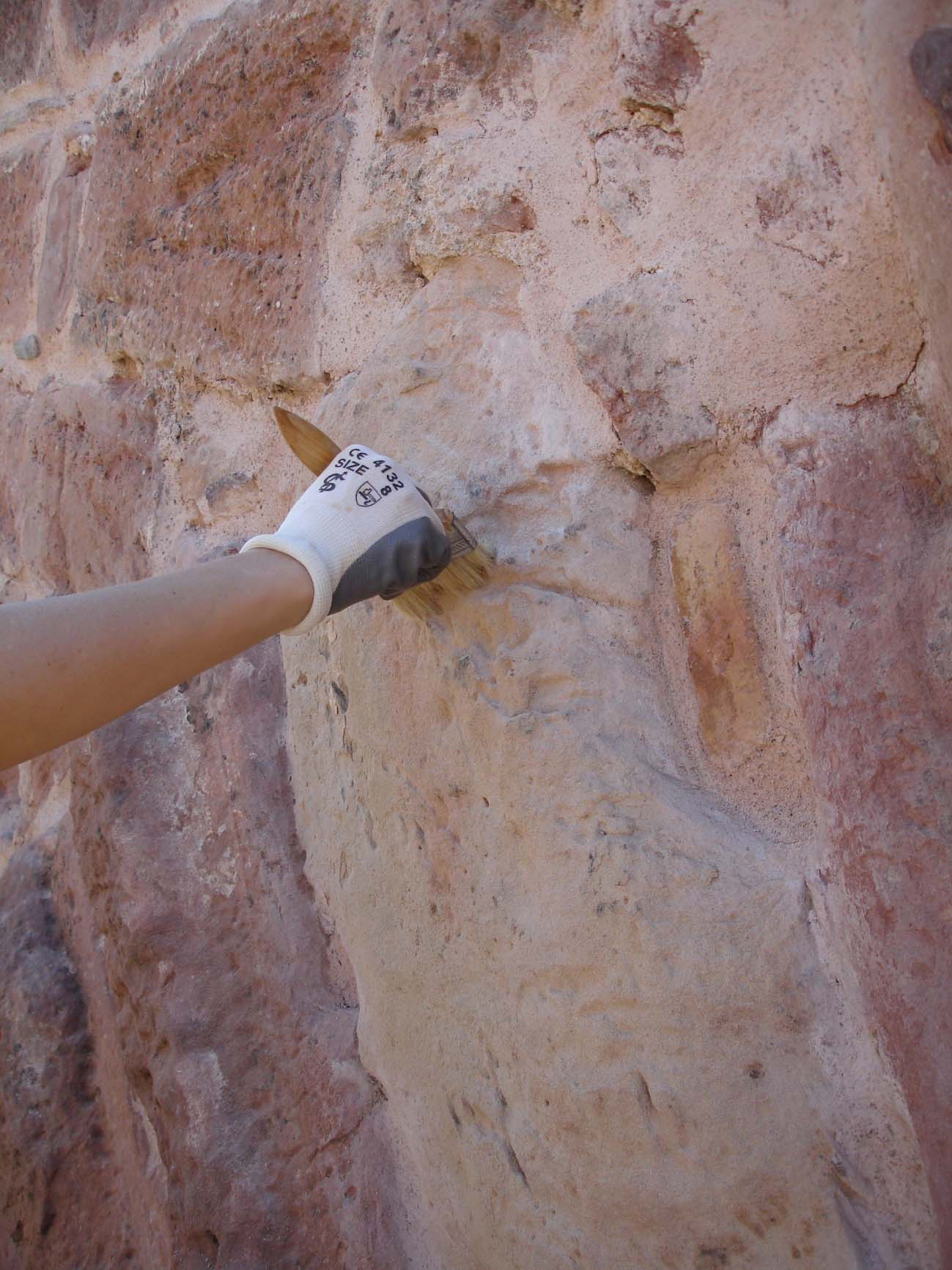 En los sillares más afectados por la pérdida de sus propiedades mecánicas se efectuó un tratamiento puntual de consolidación a base de silicato de etilo.