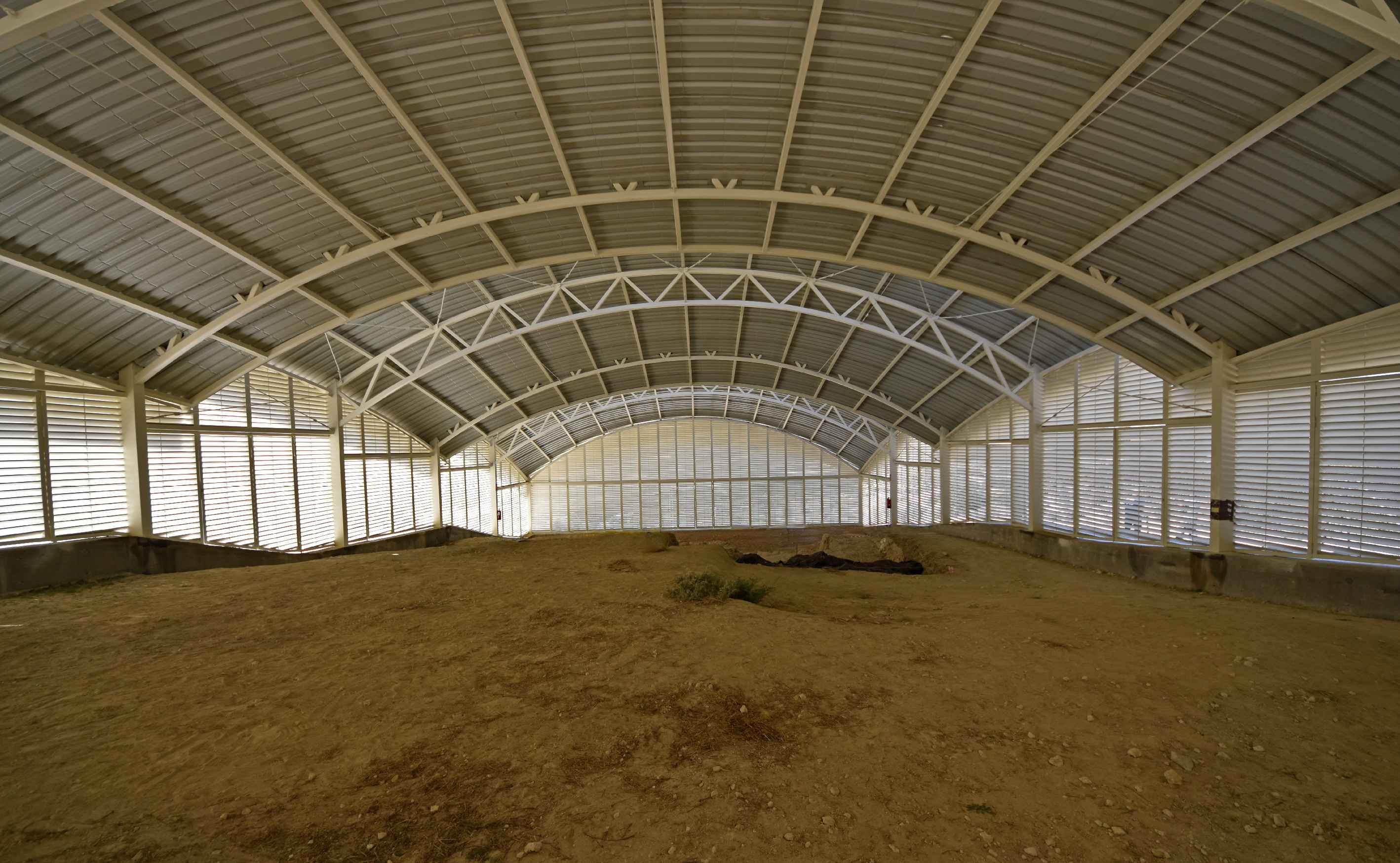 El cerramiento está formado casi en su totalidad por puertas para poder abrir y cerrar los cuatro lados de la edificación según las necesidades. Las puertas pueden plegarse totalmente y recogerse detrás de otras partes fijas de forma que no dificulten los trabajos que se realicen en el interior. Tanto las puertas como las partes fijas constan de lamas de chapa de acero galvanizado que contribuyen a la ventilación y la entrada de luz matizada al interior.