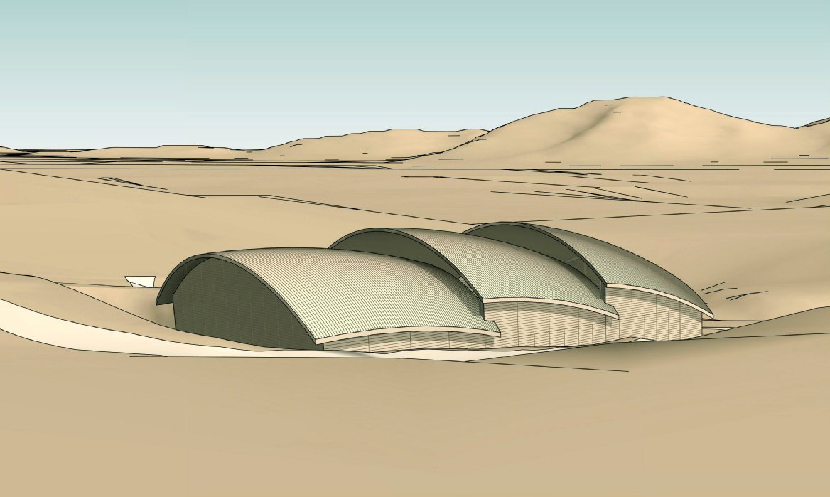 La inclinación de estos paños permite una separación entre ellos en dirección norte para la entrada de luz y ventilación. La terminación es de chapa grecada de acero galvanizado prelacado, elegido también para facilitar su integración. Su color es similar a los tonos terrizos existentes en el entorno del yacimiento.
