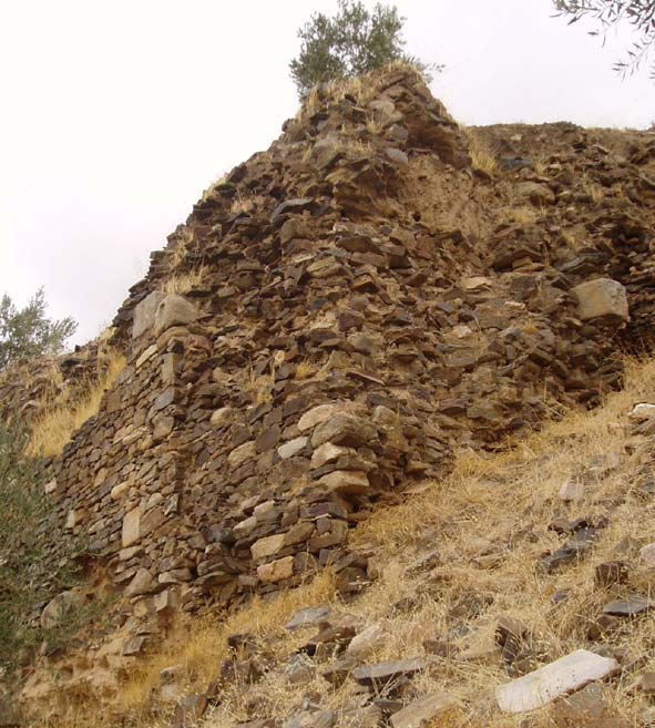 Pérdida de la cara exterior de los lienzos en gran parte del recorrido, quedando a la vista el relleno interior (argamasa, mampostería, tapial), expuesto a la acción de la erosión.