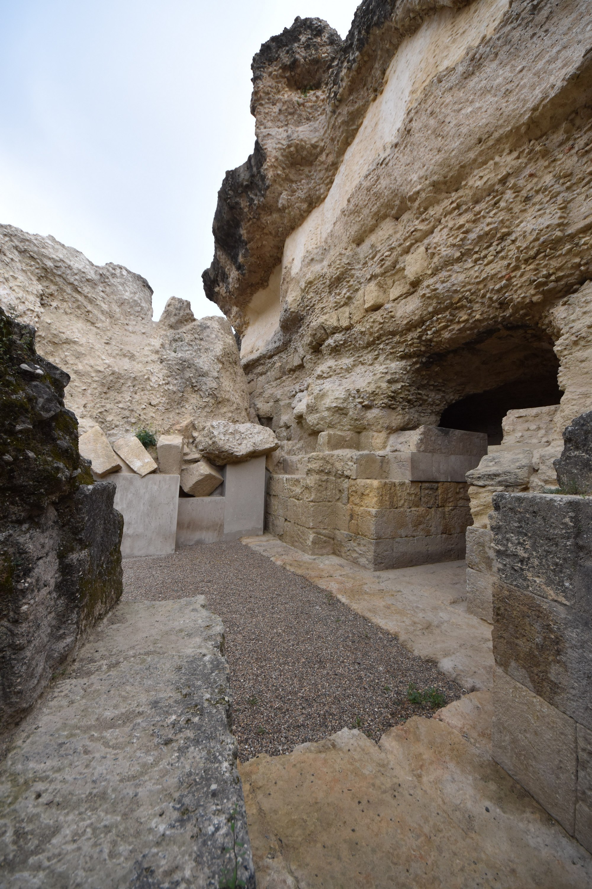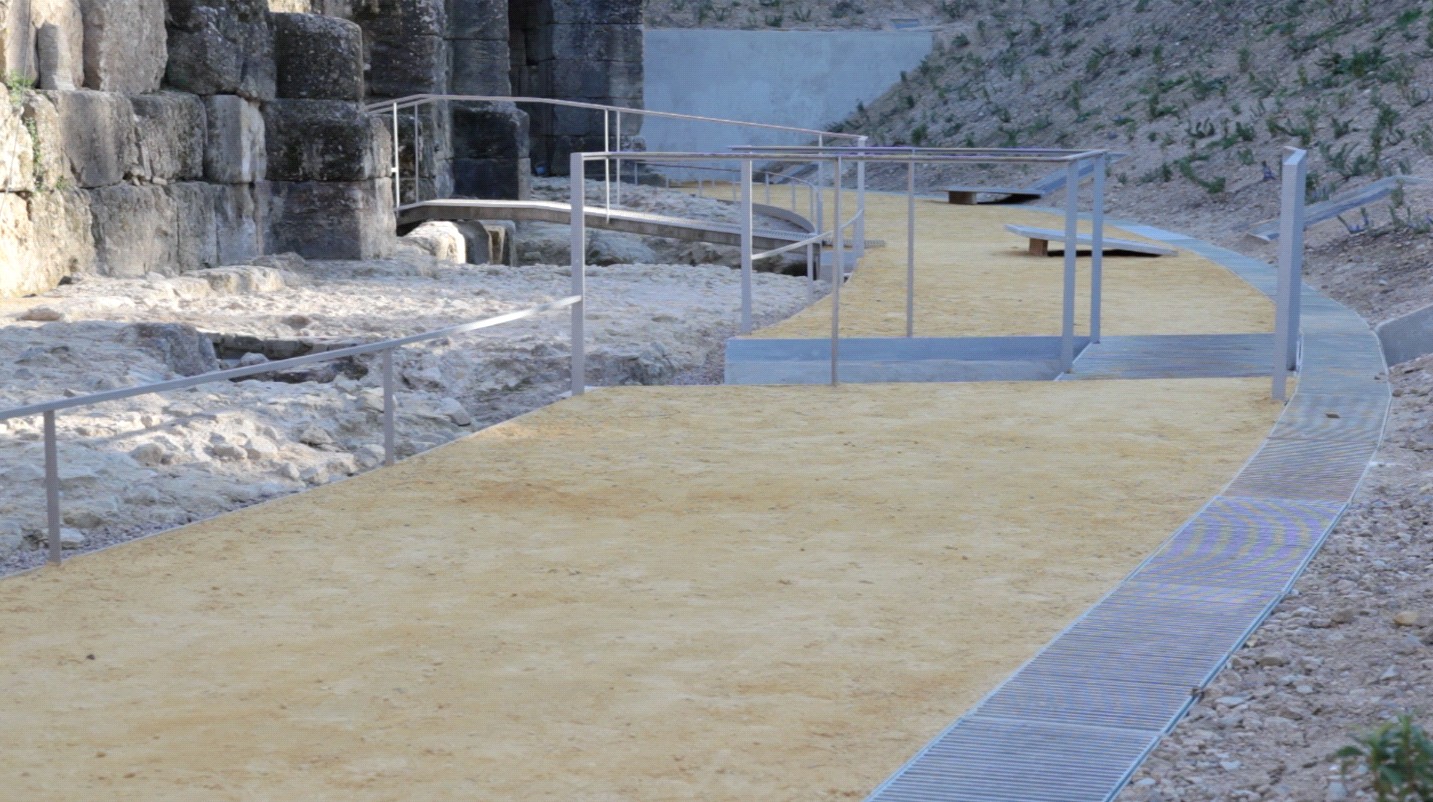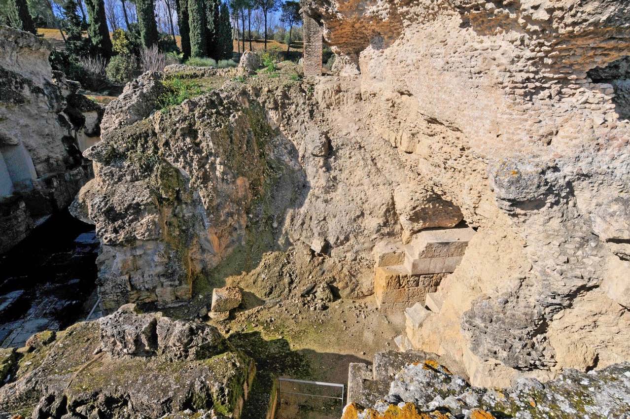 Se han actualizado los sistemas de contención en el encuentro con el edificio, se ha llevado a cabo una reordenación del sistema de drenaje -que permite encauzar la evacuación de aguas a través de las cloacas romanas- y se han construido pasarelas y caminos perimetrales de acceso y recorrido público. Las nuevas sendas se asocian al trazado del sistema de drenaje proyectado, que se dota de canalizaciones para preinstalación de electricidad (futura iluminación monumental y balizamiento) y riego.