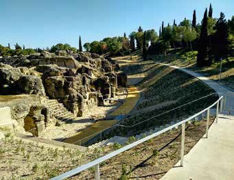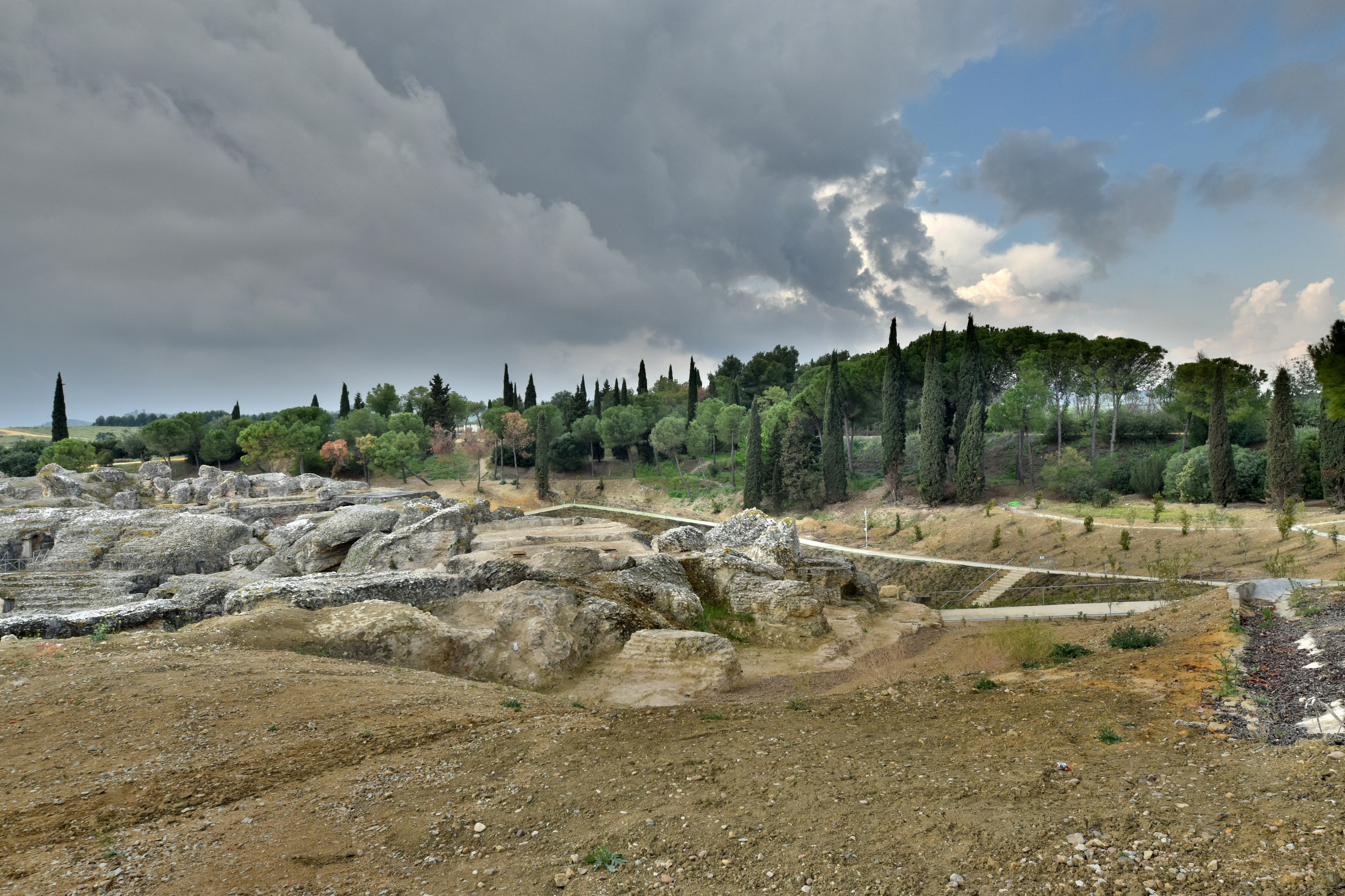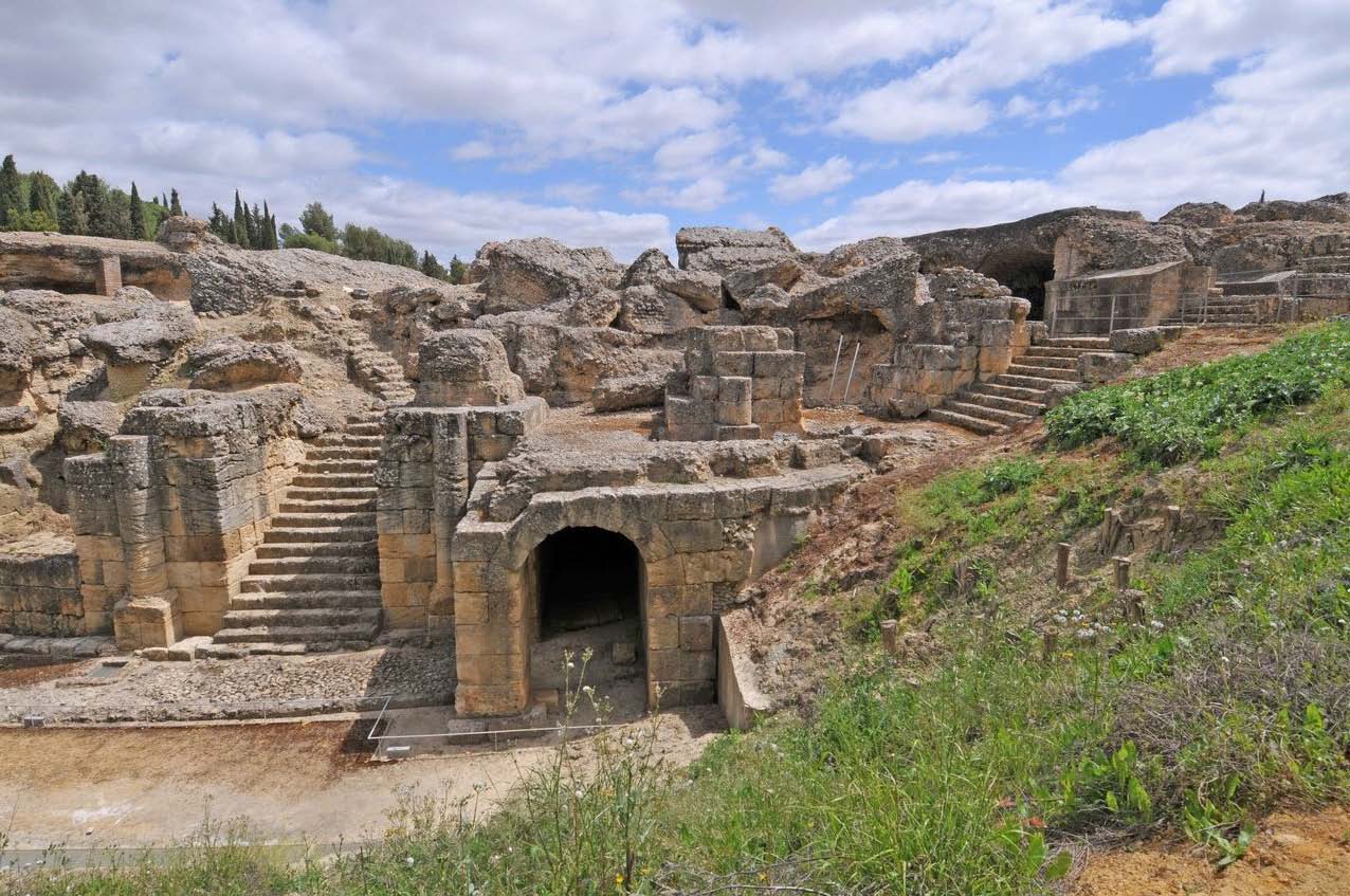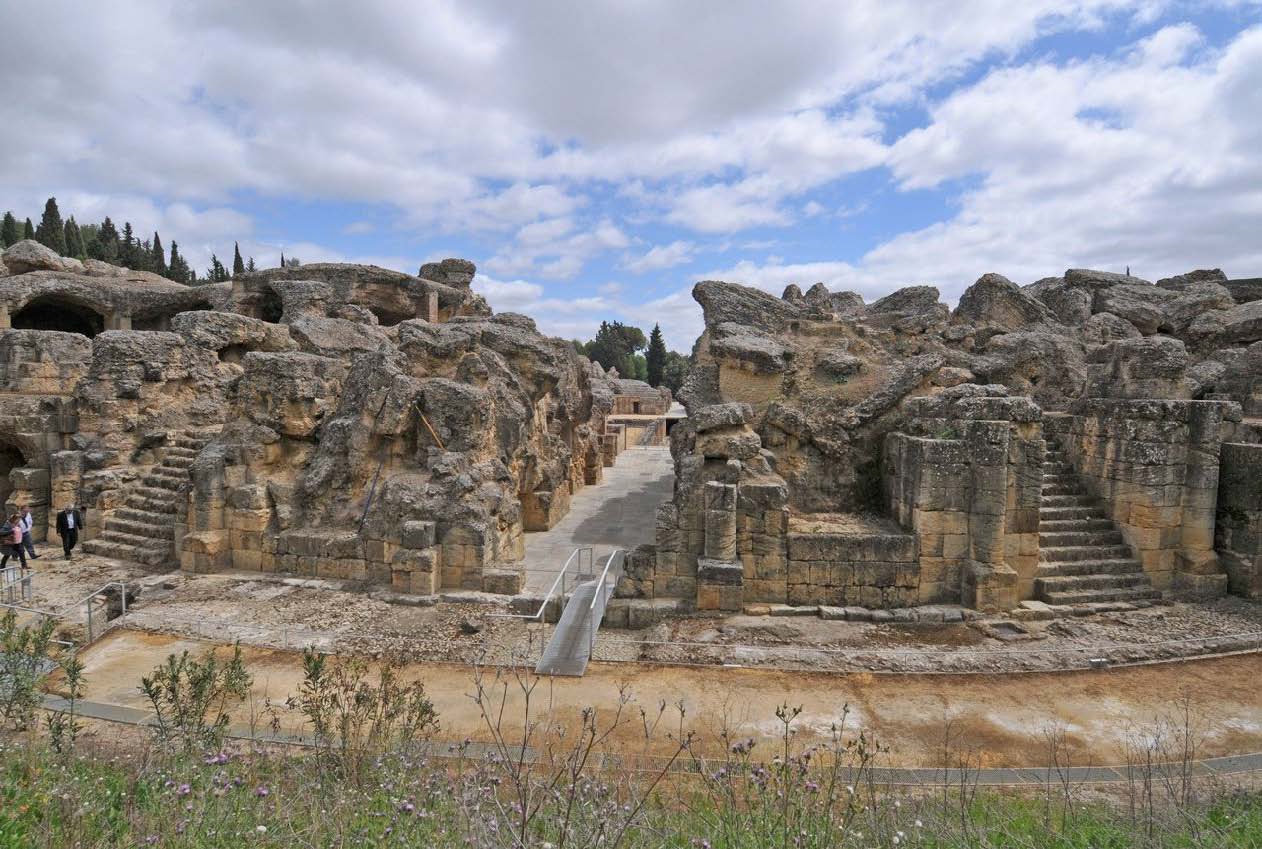 El anfiteatro de Itálica, construido en época del emperador Adriano, se encuentra entre los mayores del Imperio romano. Miden sus ejes principales 152,8 m por 130,6 m, y los de la arena 70,6 m por 47,3 m. Su aforo aproximado era de unas 20.000 a 25.000 personas.