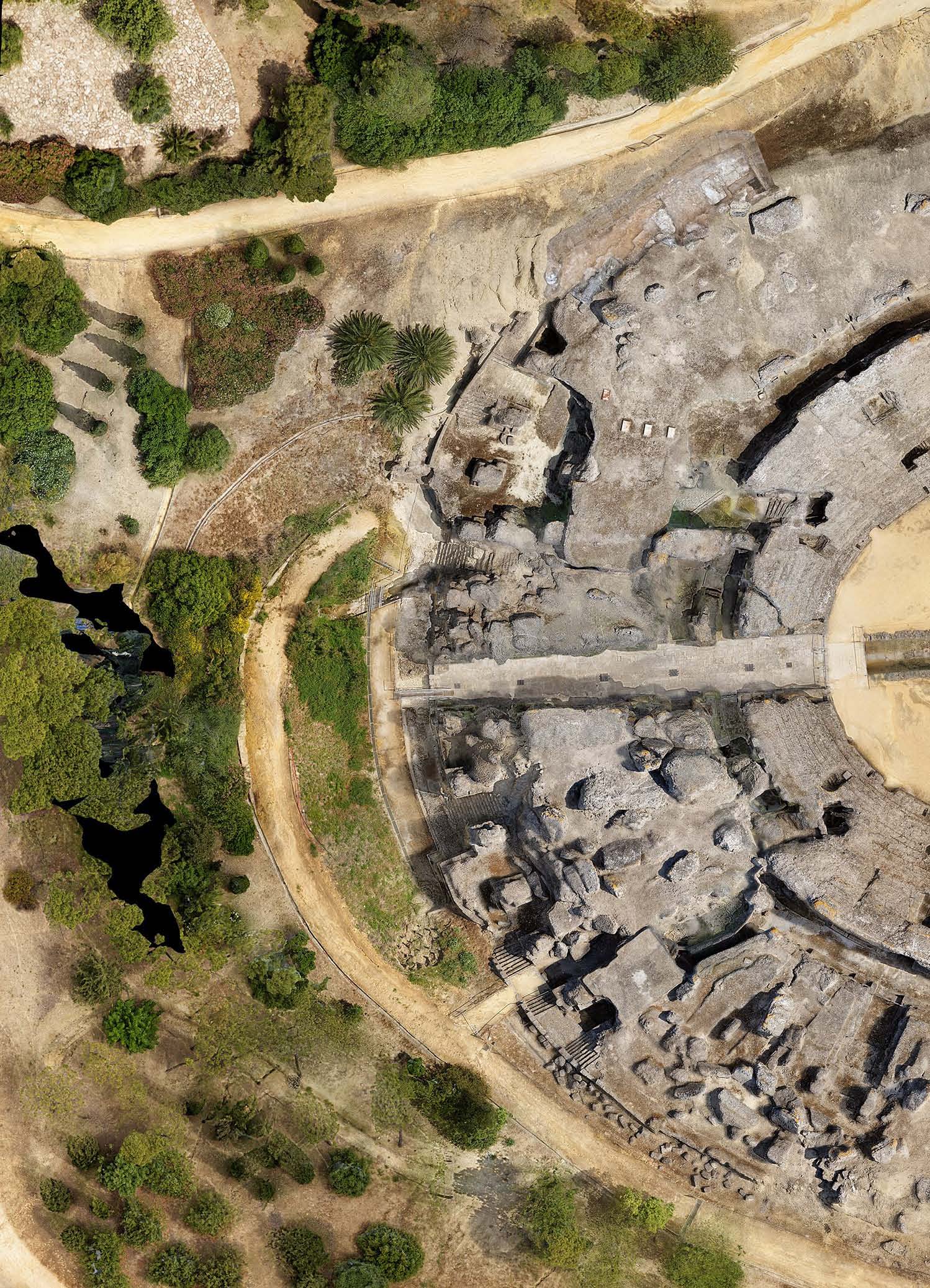 La intervención contemplada en esta reseña complementa los trabajos de consolidación estructural realizados con anterioridad en el anfiteatro y posibilita la ampliación del recorrido de visitas a este sector con extensión al exterior de la puerta libtinaria. Para hacerlo posible, se ha resuelto la incidencia que la proximidad de las laderas norte y oeste producía sobre el edificio en parte aterrado por los aportes realizados para el trazado de caminos forestales y sobre su sistema hidráulico.