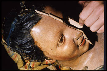 Se efectuó una media limpieza de las esculturas, entretenida por la infinidad de entrantes y salientes, que permitió recuperar una mayor riqueza, luminosidad y matices de la policromía.