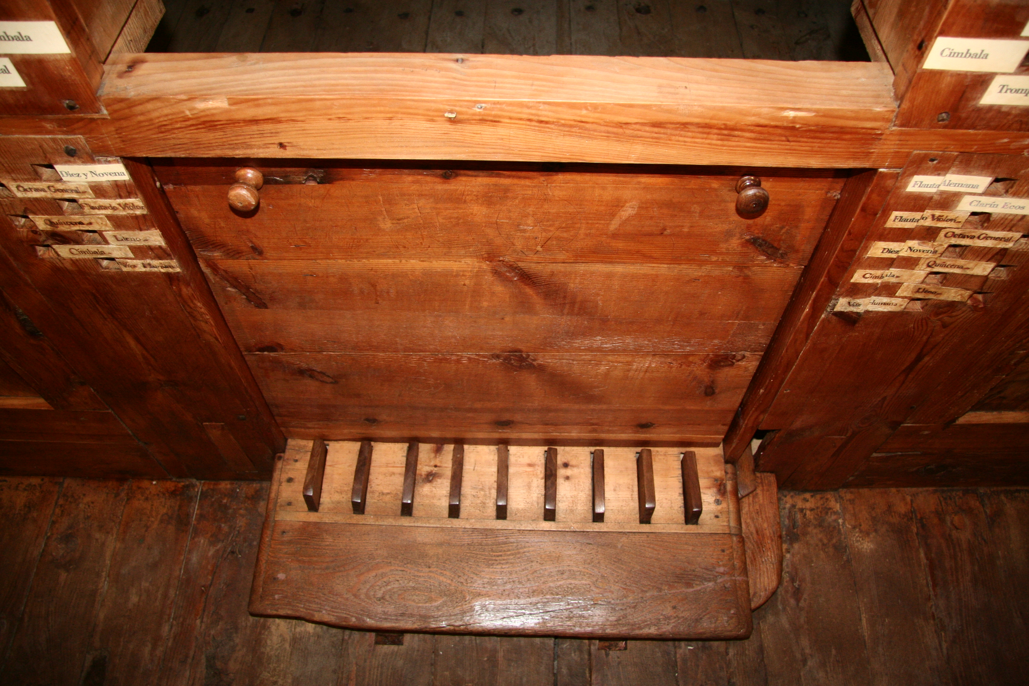 El órgano tiene dos teclados manuales de 45 teclas (C1-c5, con octava corta) correspondiendo el inferior a la cadereta interior. Hay, además, una octava de contras accionada por un pedalero de tipo francés.