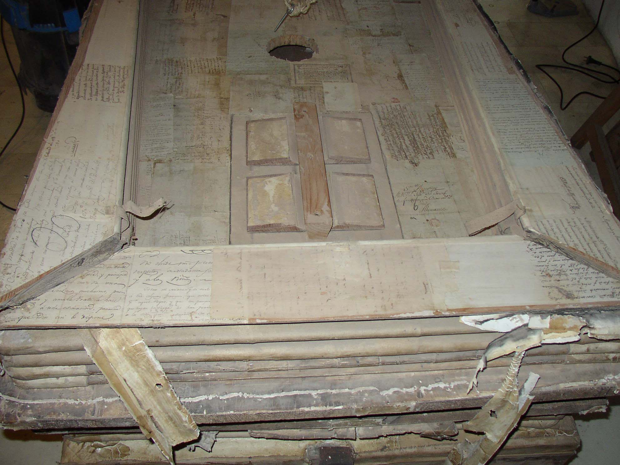 La madera presentaba un aspecto oscurecido por el depósito de residuos: polvo, excrementos, humo de velas... Además se había visto afectada por el ataque de insectos xilófagos, aunque ya no estaba activo. Había algunos elementos desplazados y otros desprendidos debido a los movimientos de dilatación y contracción de la madera y a la pérdida de adhesión de colas o ensamblajes. De entre ellos destacaba el remate del ático, cuya viga central se había separado del punto más alto del frontón, lo que había hecho que se desplazara el anagrama mariano hacia delante unos quince centímetros.