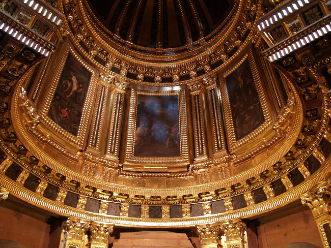 La iglesia de los santos Justo y Pastor fue construida para el Colegio de la Compañía de Jesús entre 1575 y 1589 bajo la dirección de arquitectos y maestros de cantería jesuitas. A esta orden perteneció el edificio hasta su expulsión en 1767. La construcción de la Capilla Mayor, inaugurada en 1622, es fruto de una remodelación del templo que afectó también a todo el crucero con su cúpula. Los elementos que complementan ese espacio remodelado –los cuatro retablos del crucero, el retablo mayor y los seis lienzos de los muros laterales del presbiterio- se fueron añadiendo en el curso de los años, aunque son fruto de un mismo impulso y de un proyecto unitario cuya figura principal fue el arquitecto jesuita Francisco Díaz del Ribero.