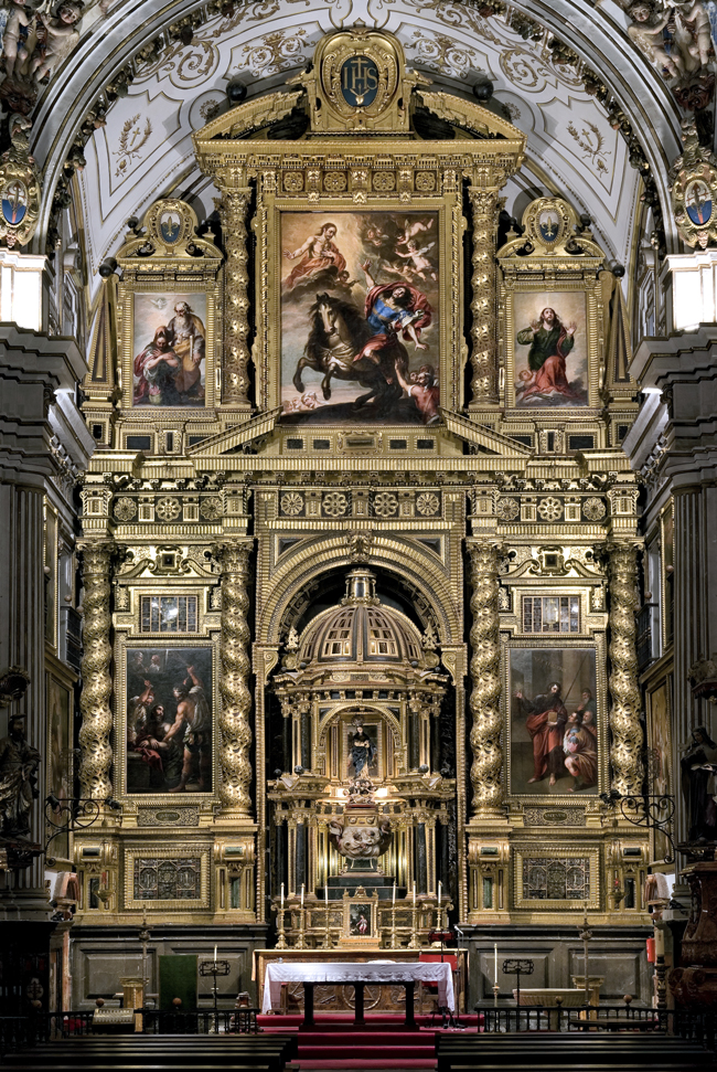 Los retablos del crucero se ejecutaron, salvo en su policromía y dorado, en la década de 1640. En la arquitectura del retablo mayor se trabajó desde, al menos, 1650 hasta 1664, distribuyéndose por ella diversos elementos pictóricos y escultóricos además de una serie de relicarios. Los relicarios, parte de ellos en dos esculturas de busto, y quizá el Crucificado del ático, del estilo de Pablo de Rojas, son piezas rescatadas de un retablo precedente inaugurado en 1610. En el manifestador se colocaron una serie de pinturas flamencas sobre cobre y seis esculturas, de las que cuatro, las de los Evangelistas, se atribuyen a Pedro de Mena. Por último, los lienzos que completan el conjunto, obra del pintor Pedro Atanasio Bocanegra, fueron pintados entre 1663 y 1679.