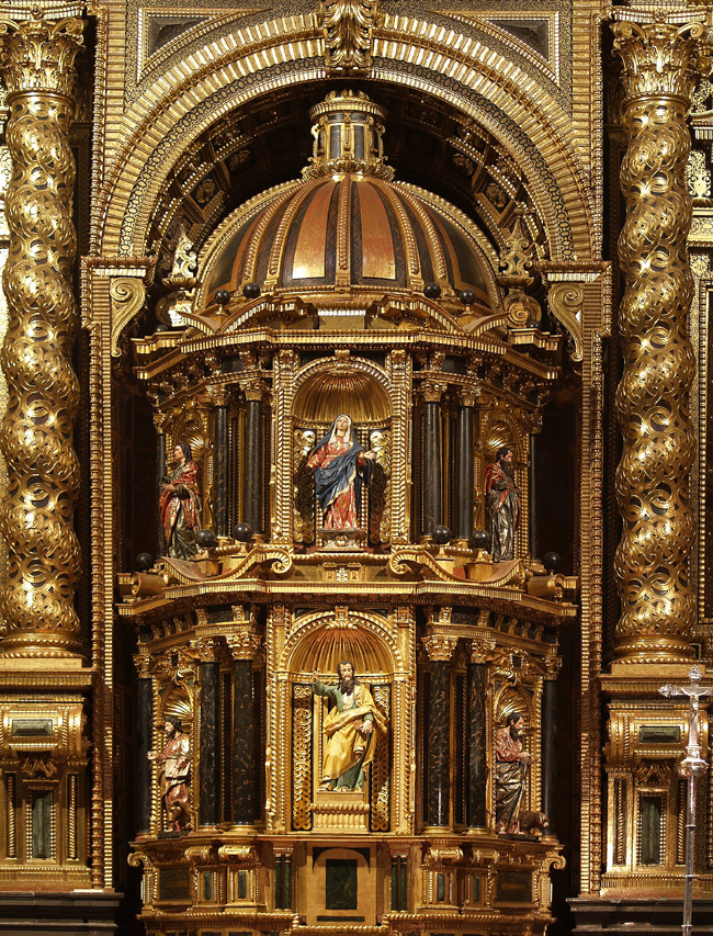 El retablo mayor es una composición monumental de un solo cuerpo y un ático. Su rasgo más sobresaliente es su capacidad de mostrar dos programas iconográficos distintos, optándose por uno u otro según la ocasión mediante artificiosos mecanismos de tramoya teatral. El manifestador, templete de grandes proporciones que ocupa el espacio central del retablo, es el elemento principal. Está dotado de un mecanismo que permite girarlo, de manera que, según la posición, ofrece un espacio convexo, con las imágenes de los cuatro evangelistas, la Virgen y san Pablo, o un espacio cóncavo, para la exposición de la Sagrada Forma, en cuyo fondo se disponen las seis pinturas sobre cobre arriba citadas, con temas de la Pasión de Cristo. En torno a los años 1950 se renovó el mecanismo giratorio del manifestador. Sin embargo, antes de la reciente intervención de restauración se había producido la rotura de uno de sus remates, que tropezaba en el arco superior, problema que ha sido finalmente resuelto.