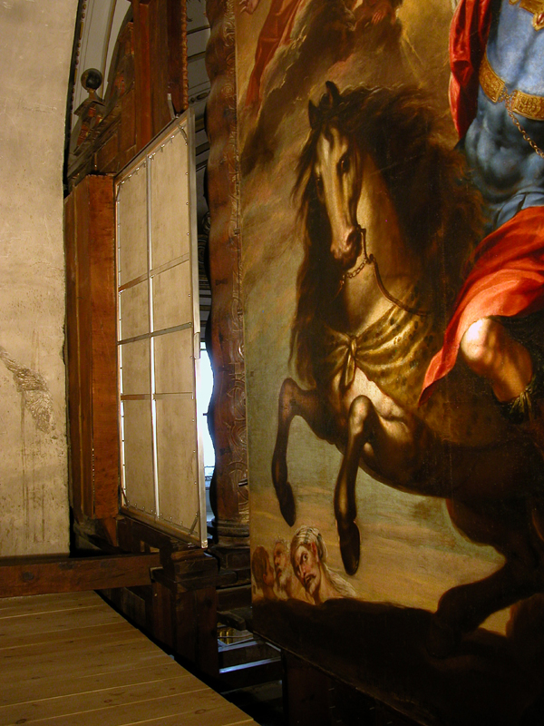 Garantizar el paso seguro de los lienzos a través de las ranuras del retablo por las que éstos se deslizaban presentaba una cierta complejidad técnica, pues las ranuras se habían deformado y estrechado con el paso del tiempo por el propio movimiento natural de la madera. La solución adoptada consistió en instalar unas guías para garantizar un desplazamiento seguro de las pinturas, eliminando la posibilidad de golpes y roces, y montar los lienzos sobre bastidores metálicos móviles con una sección muy reducida, lo que permite que estén perfectamente tensados en todo momento y que se desplacen con una cierta holgura.