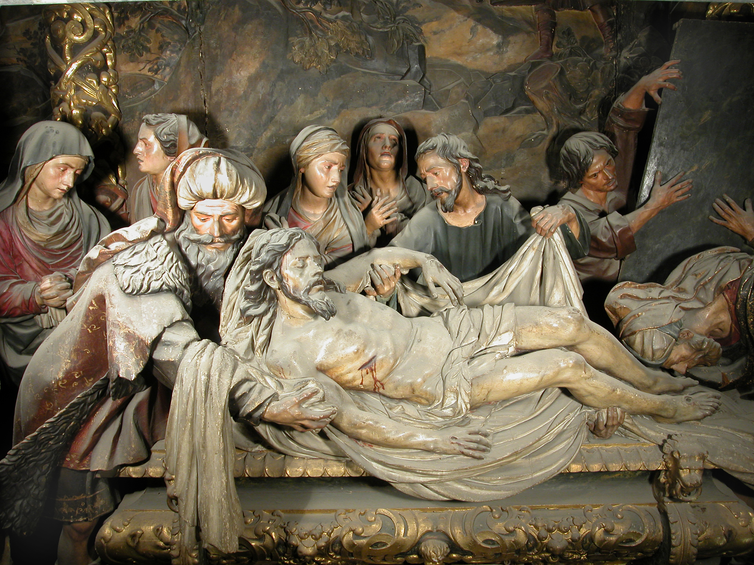 En las calles laterales se han dispuesto unos pedestales y hornacinas con arco de medio punto y remate desarrollado en vertical en el que se integran una venera, un querubín y un angelito. En las citadas hornacinas se encuentran situadas las esculturas de San Jorge y San Roque. Sobre los capiteles de las salomónicas descansa un amplio y quebrado entablamento, reforzando la sensación de movimiento del retablo. Una volada cornisa lo remata. El baldaquino central está constituido por dos columnas y dos semicolumnas de menor tamaño y no alineadas con las delanteras. Apean sobre sus capiteles dados de entablamento con ménsulas y sobre estos unos pedestales. De ellos arrancan los arcos. Sobre pechinas se dispone una bóveda que pretende ser oval, pero que resulta interrumpida por el arco frontal y que además aparece inclinada hacia el fondo. Tal solución es parte del juego de perspectiva que origina la presencia de soportes de distintos tamaños no alineados que procura dar la impresión de un espacio más amplio al que realmente existe. Bajo la bóveda se cobija la escena del Entierro de Cristo. Sobre una volada y quebrada cornisa que se alza sobre el arco frontal del baldaquino se halla el ático, centrado por un gran medallón con la alegoría de la Caridad. A ambos lados se disponen la Fe y la Esperanza. Ángeles, cartelas y florones componen el resto de la decoración. El ático se cierra mediante una moldura que se adapta al arcosolio y en la clave una cartela que enlaza con los yesos de la bóveda.